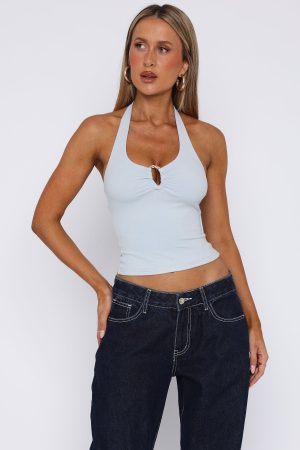 Turn heads in the Not Over It Yet Halter Top in Baby Blue! Features thick halter straps. scoop neckline. gold hardware centre front. lined and backless. Style this look to a tee with your fav lightweight pants and kitten heels for a summery look we love.