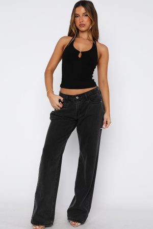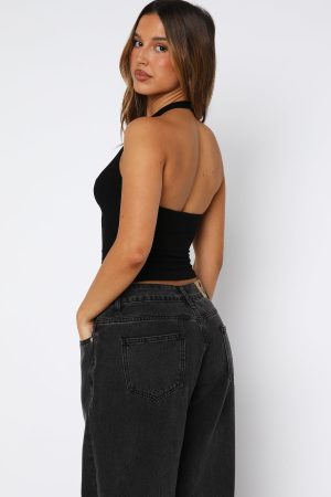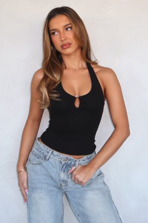 Turn heads in the Not Over It Yet Halter Top in Black! Features thick halter straps. scoop neckline. gold hardware centre front. lined and backless. Style this look to a tee with your fav White Fox jeans and kitten heels for a look we love.