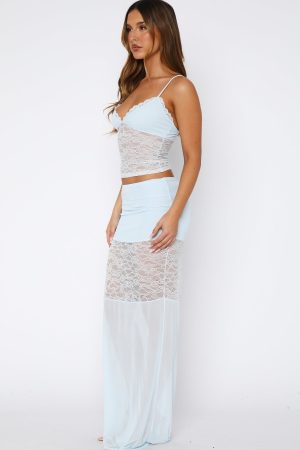 Our Not The One Maxi Skirt in Blue is simply so understated and sexy! Features a thin elasticated waistband. alternating mesh to lace panelling design and lined till mini skirt length. Pair with the matching Not The One Top and kitten heels for the perfect date night fit on a hot summers night!