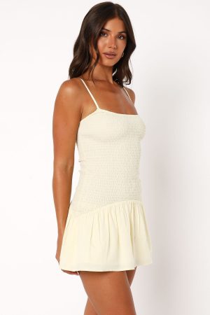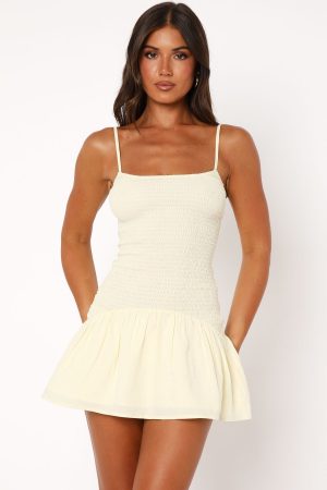 Put on this mini dress and get ready to stun! The Nothing Is Over Mini Dress Lemon features thin. adjustable shoulder straps. square neckline. unlined. ruched bodice. lined skirt with frill detailing and stretch material for an easy slip on design.