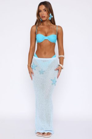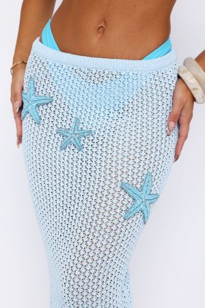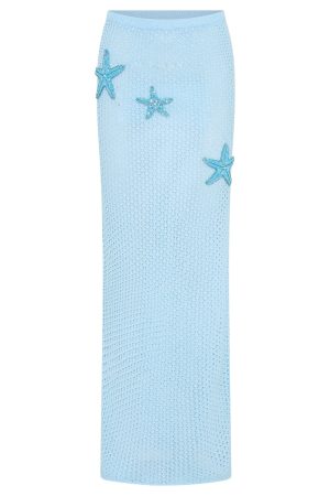 Welcome your next standout maxi skirt for this Summer. The Ocean Starlet Maxi Skirt in Baby Blue features elasticated waistband. thick fabrication and beaded starfish detailing across side front. Complete the look with your favourite White fox bikini. kitten heels and gold accessories for a look we can’t get enough of.
