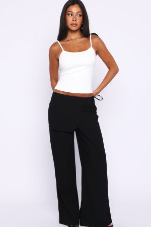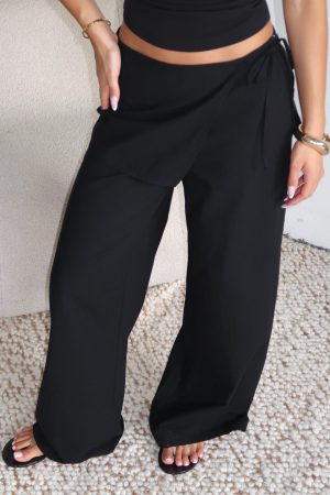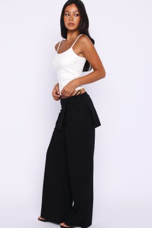 The Off Beat Pants in Black scream summer! These pants feature a fixed waistband with flowing fabric around the waist that ties into a bow. a breezy wide‑leg silhouette. and a smooth. invisible side zipper with hook‑and‑eye closure. unlined for lightweight comfort. Pair with a basic singlet and sandals for a relaxed long lunch fit.