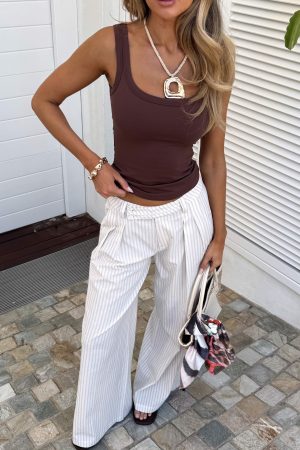 Wear to: midday markets. The Office Romance Wide Leg Pants White/Beige Stripe feature a fixed waistband with a bold double‑button closure. zipper and hook‑and‑bar fastening. and belt loops. Functional side pockets add practicality. while the unlined wide-leg cut drapes loosely for an breezy fit. Pair them with flat sandals and a relaxed top for effortless daywear.