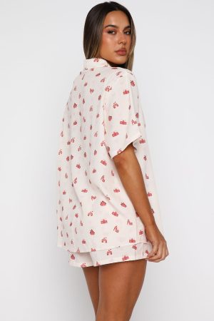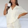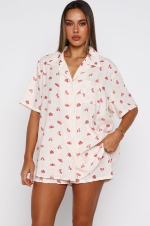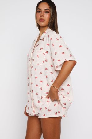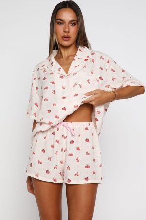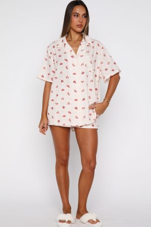 Introducing your new fave summer sleepwear…the Offline Pyjama Set in Gingerbread Dreams! This adorable set features a collared neckline. a button-front closure. and a side pocket with embroidered White Fox text. Made from lightweight. breathable fabric with an unlined interior. it keeps you cool all night. The elasticated waistband with a drawstring tie ensures a comfy fit. and the mini length paired with the sweetest gingerbread house print gives it serious style.