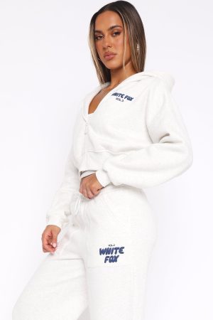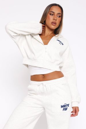 The Best Just Got Better! The Offstage Cropped Zip Hoodie Mineral Grey features an oversized fit. zip front. ribbed hemline and cuffs. collared neckline. cropped length. puff print logo side front and centre back and soft fleece fabric for extra comfort to keep you feeling cosy and warm! Pair with the Offstage Sweatpants for a casual look!