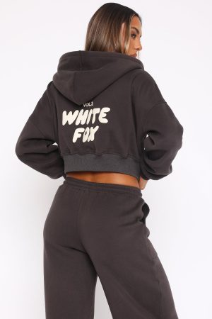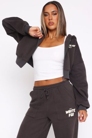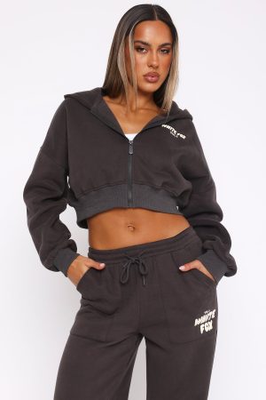The Best Just Got Better! The Offstage Cropped Zip Hoodie Shadow features an oversized fit. zip front. ribbed hemline and cuffs. collared neckline. cropped length. puff print logo side front and centre back and soft fleece fabric for extra comfort to keep you feeling cosy and warm! Pair with the Offstage Sweatpants for a casual look!