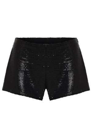Shorts just got shorter. The Old New Shorts in Black features a super cute sequin embellished fabric. low rise fit. hidden side zipper with hook and eye. lined fabric. booty cut length and leopard print. Keep it on trend and pair with a black tee and kitten heels!