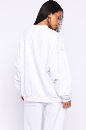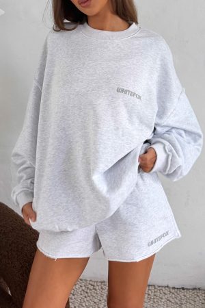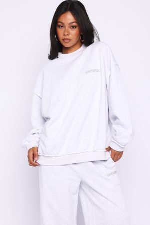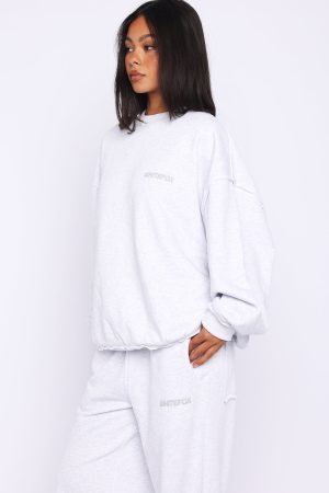 Cosy and cute in the On My Own Terms Oversized Drop Shoulder Sweater Grey Marle. Designed with ribbed crew neckline. drop shoulders and ribbed hems with raw cut detailing which round out an oversized silhouette. Featuring long sleeves. and an unlined fleece interior. this sweater delivers a cozy feel. Finished with White fox puff print text side front. Style with the matching On My Own Terms Lounge Shorts Grey Marle or On My Own Terms Wide Leg Sweatpants Grey Marle.