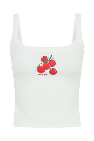 Explore beautiful European towns in the On The Vine Tank Top in White! features thick straps. a square neckline. ribbed fabrication and the cutest graphic and White Fox text centre front. Effortlessly pair with the On The Inside Booty Shorts Black/White Polka Dot for the most relaxed but cute fit!