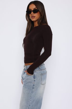 The Only For Tonight Long Sleeve Top in Dark Chocolate is the basic your wardrobe is waiting for. This top is fitted with long sleeves and soft. stretch jersey fabric. Pair with your favourite pair of White Fox Denim Jeans and gold hoops for an elevated everyday look!
