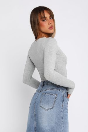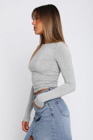 The Only For Tonight Long Sleeve Top in Grey Marle is the basic your wardrobe is waiting for. This top is fitted with long sleeves and soft. stretch jersey fabric. Pair with your favourite pair of White Fox Denim Jeans and gold hoops for an elevated everyday look!