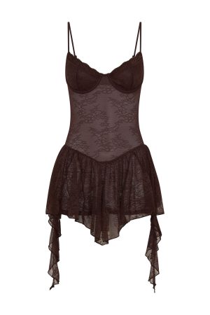 Phone on DND and fit on fire. The Only Tonight Lace Playsuit Chocolate features thin adjustable shoulder straps. supportive underwire bust cups with lined shaping and sheer lace fabrication at bodice. Finished with built‑in shorts and sash accents off the skirt hem for a sultry vibe. Style with cowboy boots to steal the spotlight.