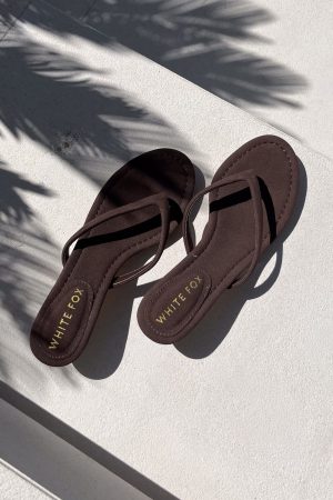 Complete your summer looks with the Orion Thong Kitten Mules in Chocolate Faux Suede. Features a round open toe. slim thong strap. and elegant kitten heel in a soft faux‑suede finish.