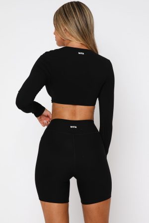 Get in your element in the Over The Line Long Sleeve Crop Black. Features a plunge neckline. long sleeves. fitted design and logo detailing. Pair with one of the matching Go Getter High Waisted Leggings or Keep Up High Waisted Shorts for a look we are loving!