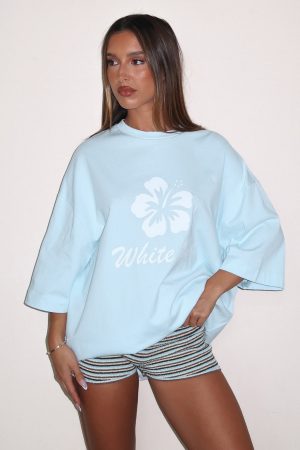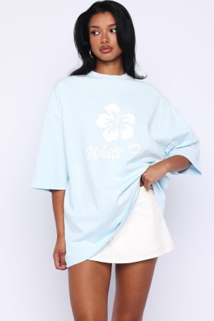 Pretty in pink! The Own Your Glow Oversized Tee in Blue features a classic crew neckline. drop shoulders. relaxed short sleeves. and a breezy oversized fit. It’s crafted from soft. unlined fabric and accented with White Fox text and a delicate hibiscus graphic. Pair it with laid-back shorts and sunnies for the sweetest weekend vibe.