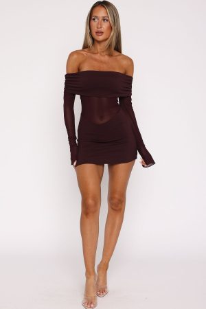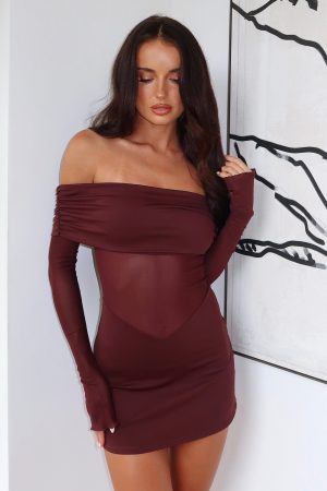 Your date night outfit dilemmas are sorted with the Own Your Story Long Sleeve Mini Dress Burgundy. Features an off the shoulder design. long sleeves with slight flare. mini length. sheer bodice and sleeves. ruched detailing. gorgeous fabric with an iridescent glow. and stretch material for an easy slip on design. Style with statement heels and a shoulder bag for a look that’s sure to turn heads.