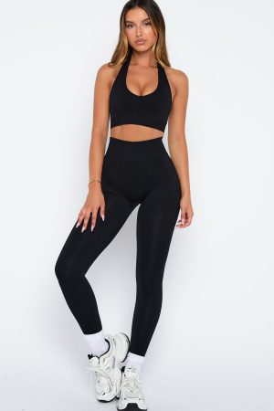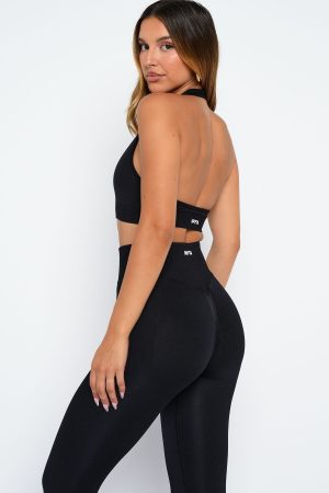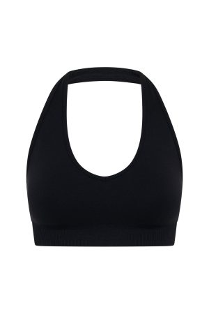 Introducing the Pace Seamless Sports Bra in Black. your daily active essential. Designed with a fixed halter strap. scoop neckline. ribbed elasticated under bust hem and removable padding for customizable comfort. Finished with WFA initials at the centre back and crafted from soft. seamless fabric. Style with the matching Charge Seamless Leggings or Zoom Seamless Shorts 4 for a flawless active fit.