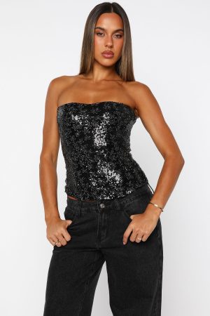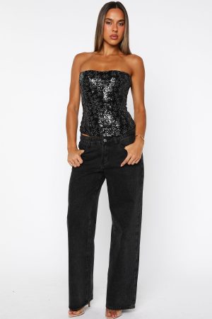A trusty combo! The Paint The Sky Strapless Bustier in Black features a secure strapless neckline with grip tape. structured support via internal boning. and eye-catching floral sequin detail. Fully lined and finished with a back zipper plus hook‑and‑eye closure. it’s all glam. no fuss. Style with the matching Paint The Sky Sequin Mini Skirt and simple jewellery.
