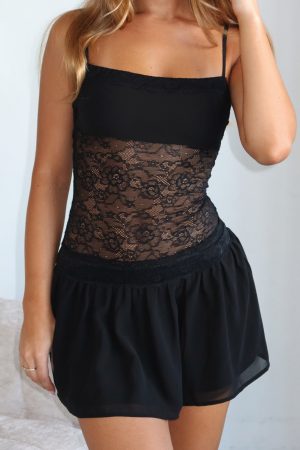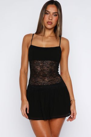 Sweet and sexy. our Paris Lights Mini Dress in Black is everything you need for the season of love. Features thin adjustable straps. square neckline with lace trim detailing. lined bust and skirt bottom with sheer lace bodice. backless. adjustable back strap closing centre back and zipper with hook and eye closure centre back. Pair with dainty kitten heels and simplistic jewellery to leave all the sexiest for the dress!