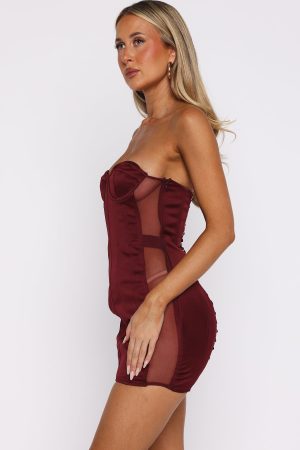 Blow out your candles in style with the Park Avenue Princess Mini Dress Burgundy! Features a strapless neckline. underwired bust cups. and internal boning that flows into faux‑boning panels. This fitted silhouette boasts a corset‑inspired lace‑up back. sheer mesh detailing along the sides. an invisible zipper. and full lining. Pair it with heels and a statement bag for a show‑stopping look.