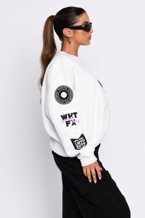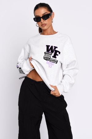 Get cosy in the Part Of History Oversized Sweater in Grey Marle. This jumper is a vintage look with a high scooped neckline. ribbed neckline. hemline and cuffs. fleece lining and White Fox logo on sleeves and front side. Pair with bike shorts and sneakers for the ultimate off-duty look!