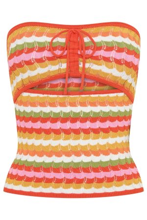 Spring break state of mind in the Past Curfew Strapless Knit Top in Sugar and Sweets. Featuring a secure strapless neckline with grip tape support. subtle ruching at the bust and a playful cut‑out under the bust. The unlined knit fabrication keeps it breezy. Style with the matching shorts. sunnies and sandals for laid‑back beach energy.