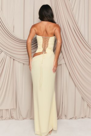 Celebrating love in the Peach Fizz Strapless Maxi Dress in Lemon. Features a strapless neckline with built-in grip tape and internal boning for a secure. sculpted fit. It has an invisible side zipper with hook-and-eye closure. a corset-inspired lace-up back. and an attached maxi skirt with a beautifully draped asymmetric cut-out at the waist. Finished fully lined for comfort. Style with kittens to dance through the night.