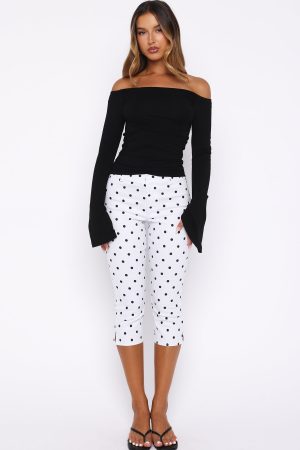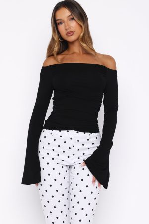 The Perfect Night Long Sleeve Top in Black redefines a wardrobe classic with an effortlessly chic silhouette. Features an elegant off-the-shoulder neckline with ruched detailing. long sleek sleeves. a fitted bodice and high-stretch fabrication with ruched sides that flatter the form. Unlined for light comfort and seamless styling. Style with your go-to denim jeans. sandals and layered gold jewellery for a refined take on relaxed glamour.