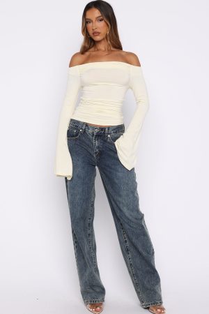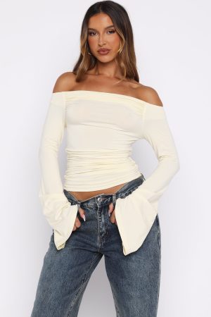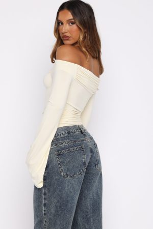 The Perfect Night Long Sleeve Top in Cream redefines a wardrobe classic with an effortlessly chic silhouette. Features an elegant off-the-shoulder neckline with ruched detailing. long sleek sleeves. a fitted bodice and high-stretch fabrication with ruched sides that flatter the form. Unlined for light comfort and seamless styling. Style with your go-to denim jeans. sandals and layered gold jewellery for a refined take on relaxed glamour.