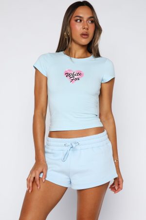 Big hearts deserve big style moments! The Permanent Love Baby Tee in Baby Blue is designed with a classic round neckline. cap sleeves. fitted silhouette and printed heart graphic with cursive White Fox text at the front. Pair with your fav lounge shorts and slides for a cosy weekend fit!