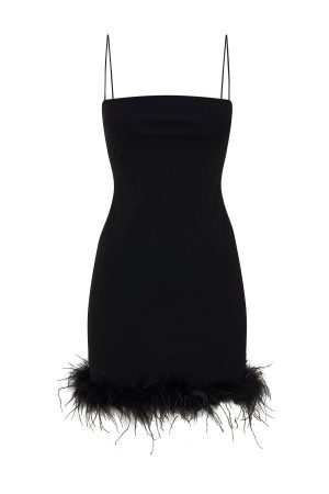 The Petty Princess Mini Dress in black channels feminine charm with a playful. carefree edge. It features thin elastic straps. a flattering square neckline. and soft mesh lining. Finished with a flirty faux fur hemline and an invisible zipper with hook‑and‑eye closure. Finish your look with a trending polka dot combo of heels and a matching bag so all eyes are on you.