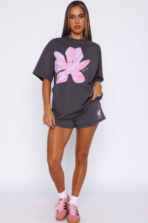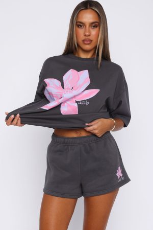 Refresh your loungewear with the Pick You A Flower Lounge Shorts in Volcanic. Features a thick elasticated waistband with inner drawstring. two side pockets. soft fleece lining for extra comfort and a design side front. Team with the Pick You A Flower Oversized Tee in Volcanic and layer with the Pick You A Flower Oversized Sweater Volcanic for colder days.