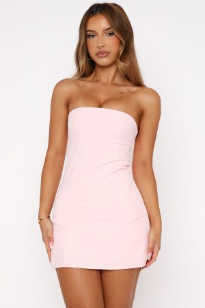 Level up in the Played You Playsuit Baby Pink. Features a strapless design with gel grip on bust. lined. fitted bodice. invisible back zipper and clasp closure. mini length and fake pocket detailing. Pair with kitten heels and statement accessories for a look that means business!