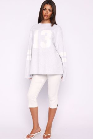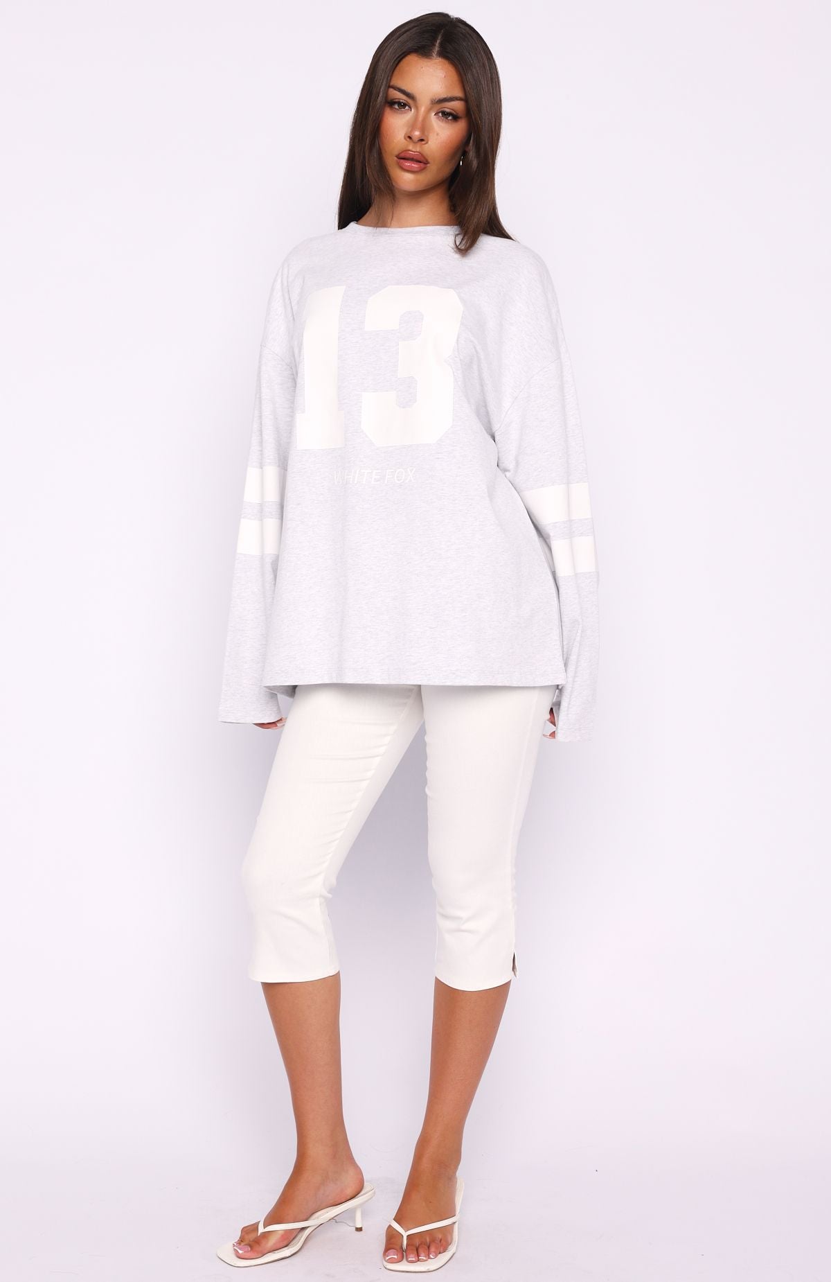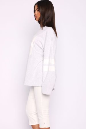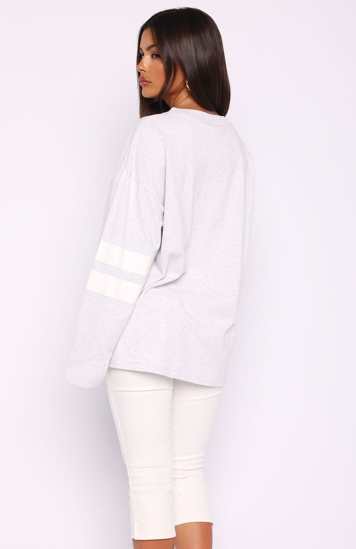Unwind in style in the Playing Ball Oversized Long Sleeve Tee Grey Marle! Featuring a round ribbed neckline. drop shoulder design. long sleeves. printed White Fox graphic centre front. stripe graphic dealing on sleeves and soft fabrication for all day comfort. Pair with your fav lounge shorts for the cutest look!