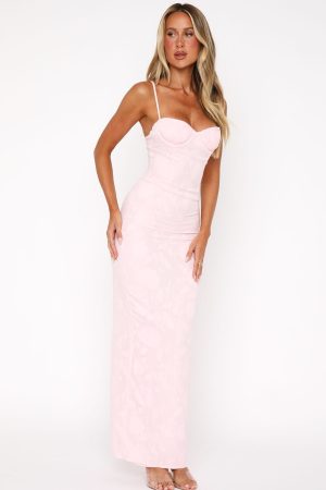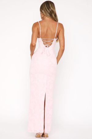 The Poppy Dream Maxi Dress Baby Pink features thin adjustable straps. bust cups and underwire. ruched design at bust cups. lace up back design for a desired fit. lined fabric. semi-sheer. high cut side split at hemline. maxi length and a gorgeous floral fabric. Pair with a kitten heel and mini bag for a chic vibe!