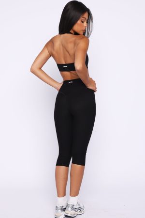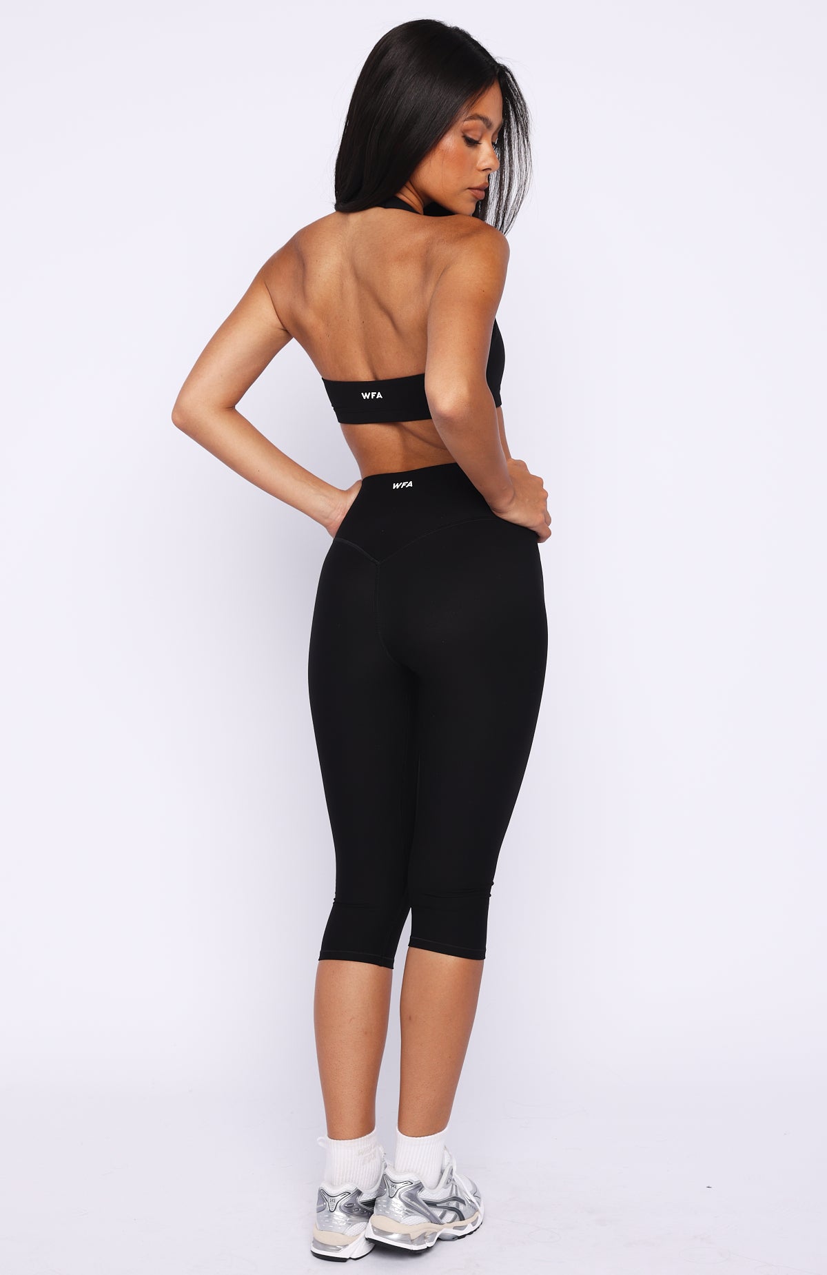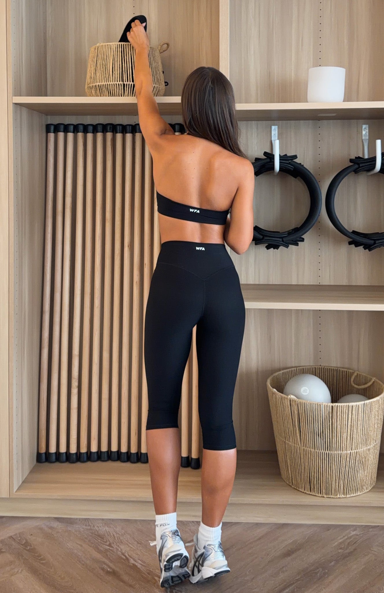 The active style of the season: capris. The Powerhouse Capri in Black features a supportive thick waistband. a flattering capri length. and high‑stretch fabrication for comfort. Unlined for a lightweight feel. it’s finished with printed WFA initials at the center back for a signature look. Style with the matching crop or tank for a cute set.