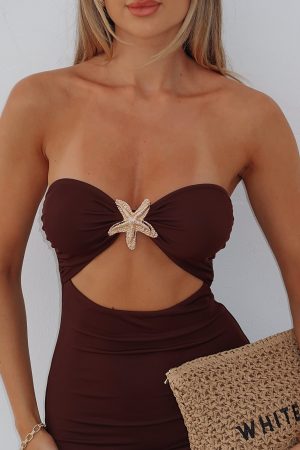 Make a splash in the Pray For Forgiveness Strapless Maxi Dress Chocolate! Featuring a strapless design with gel grip on bust. centre front cut out design with gold hardware embellishment. maxi length. back split detailing and stretch material for an easy slip on design. Pair with a clutch and layered gold accessories!