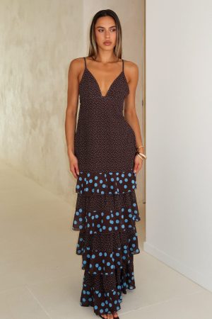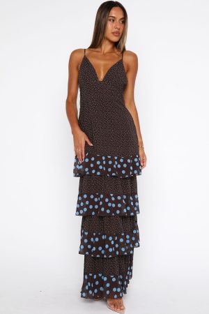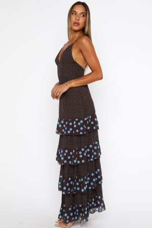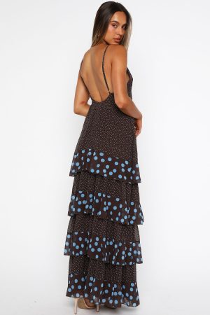Flow through summer in the Princess Maxi Dress Chocolate/Blue Polka Dot. Features thin adjustable straps. a flattering V-neckline. under-bust seam. tiered skirt layers. an open back. and a discreet side zipper with hook-and-eye closure. Style it with your favourite sandals and layered gold jewellery to take you seamlessly from brunch to sunset cocktails.