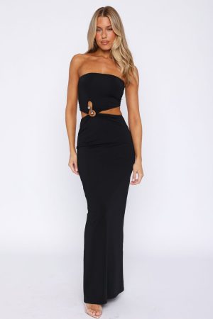 Feel truly unique in the Probably True Strapless Maxi Dress in Black! Features a strapless neckline. cut out design on waist with silver hardware and back leg split. Style this with heels and chunky jewellery for a standout fit!