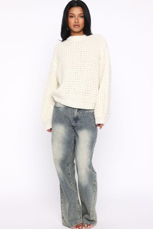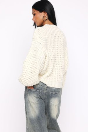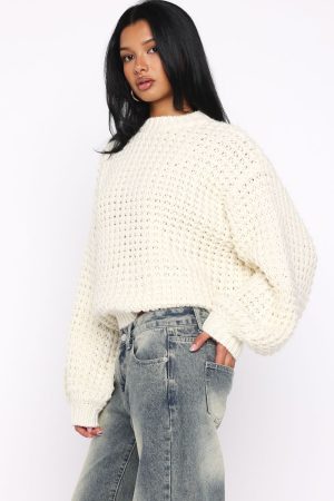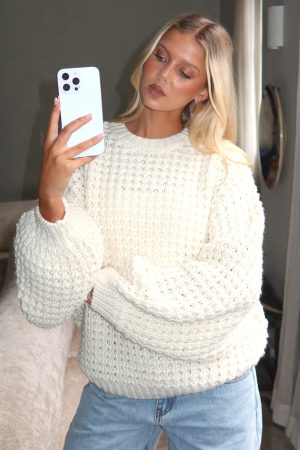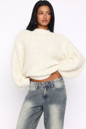 Snuggle season starts now. The Pure Comfort Knit Sweater in Cream is your go-to cozy layer. With a scoop neckline. slouched shoulders. and long sleeves featuring bishop cuffs. it offers a relaxed. oversized fit. The thick knit and ribbed waistline add texture and warmth. making it perfect for layering on chilly days. Style with your go-to White Fox denim jeans and layered gold jewellery for a cute and cosy fit.
