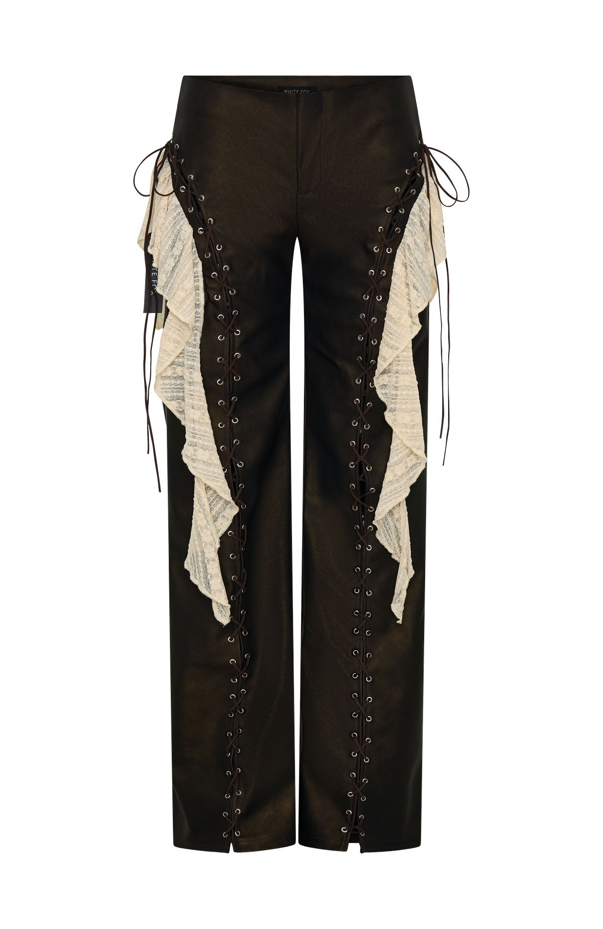Main character moment in the Pure Energy PU Pants Chocolate. Features a sleek fixed waistband with secure hook‑and‑bar with zipper closure. lace sash details at the hips. bold lace‑up criss‑cross accents down the pant legs. and a wide‑leg silhouette in PU fabrication with an unlined feel. Style with