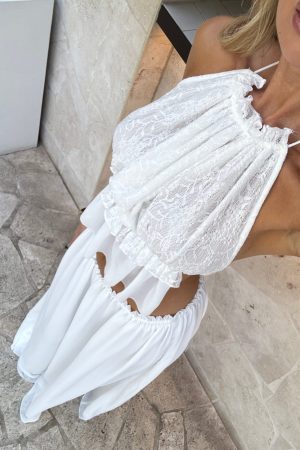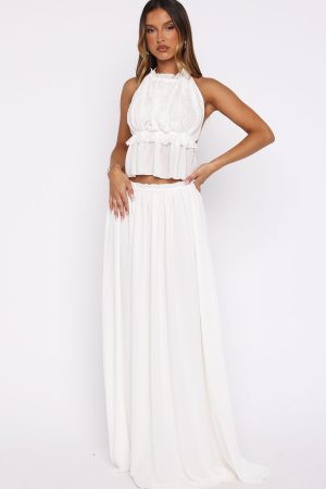 Embrace golden-hour glamour in the Pure Magic Top in White. Featuring halter straps and a high neckline. this top offers a loose bust with an under-bust adjustable tie at the centre back. The design flows into a sheer chiffon panel at the front. adorned with delicate lace detailing on the bodice and a backless silhouette that exudes sophistication. Style with the matching Pure Magic Maxi Skirt and simple sandals for that summer state of mind look.