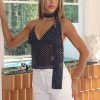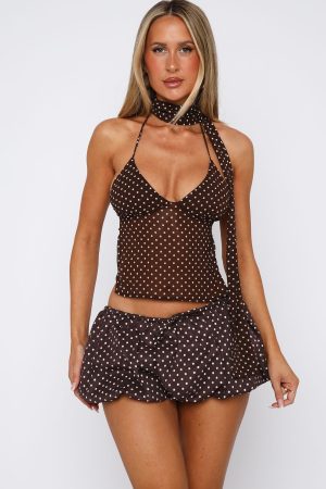 The Quick Getaway Top in Navy Polka Dot is the ultimate cool girl top! Features a halter neckline with self tie straps. self tie straps centre back for support. backless and separate scarf to elevate the look. Complete the look with the matching Runaway Heart Mini Skort Chocolate Polka Dot for a fit we love!