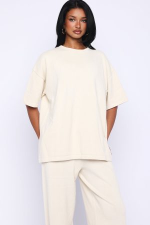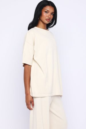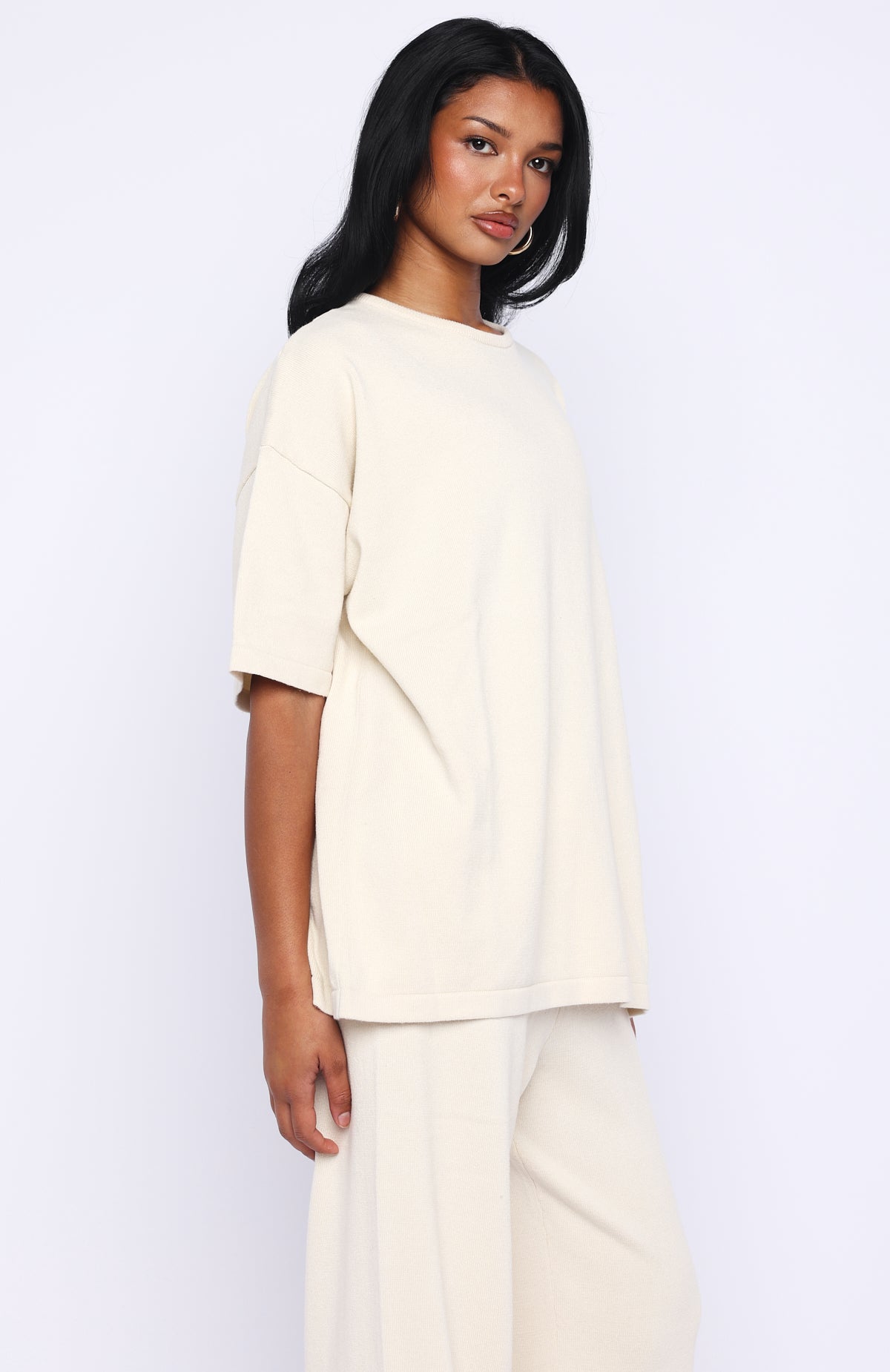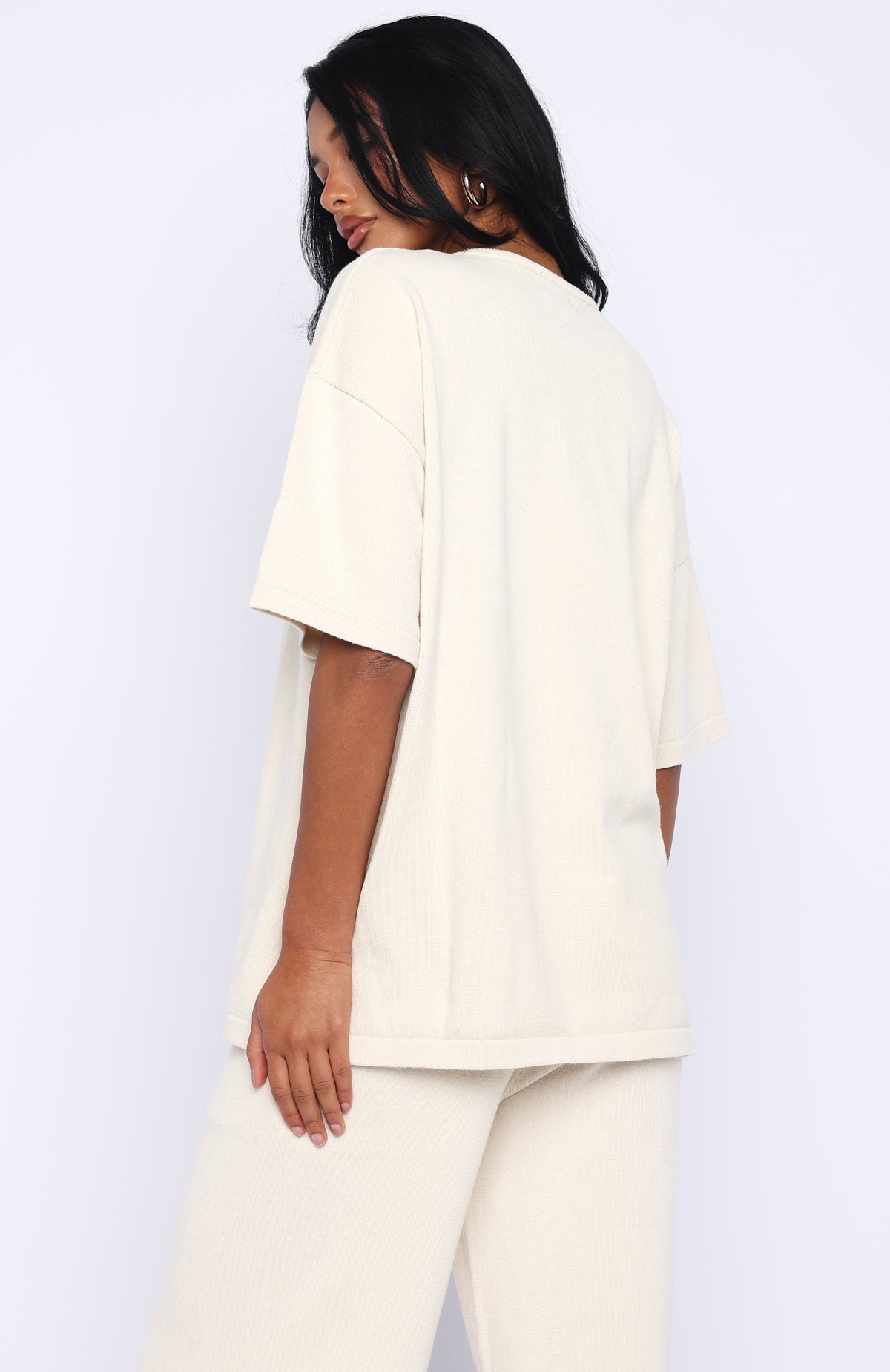 Cosy but make it chic! The Rare Catch Knit Top in Cream features a classic crew ribbed neckline. dropped shoulders. short sleeves and an oversized silhouette in soft knit fabric for relaxed but elevated comfort. Unlined for easy layering or standalone wear. it’s the perfect piece to style with the matching pants and sneakers for laid‑back. refined vibes.