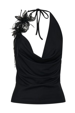 THE fit everyone will be talking about…Introducing the Rave Crave Halter Top Black. Featuring a halter neck design with back self tie straps and flower embellishments. backless design. low plunge cowl neckline and stretch material for an easy slip on design. Complete the look with the Let’s Ride Mini Shorts Black and kitten heels for a statement fit.