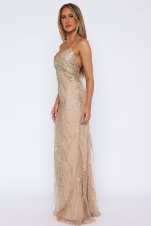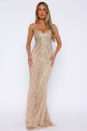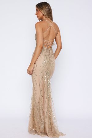 The Reaching Out Maxi Dress in Gold is created to enhance your frame and sparkle all night long! Featuring a low neckline. lace-up back design and sequin embellished fabric. Let the dress do all the talking and pair with simple accessories!