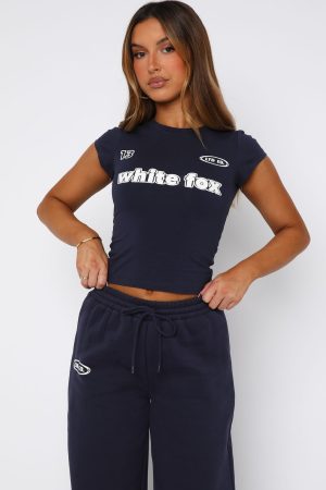 Studying has never looked cuter in the Ready To Go Baby Tee in Navy! Features a round neckline. short sleeve and signature White fox puff print text and graphics centre front. Team with the matching You’re Not Allowed Wide Leg Sweatpants in Navy for the comfiest set!