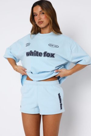 Indulge in the sporty aesthetic in the Ready To Go Lounge Shorts Baby Blue! Features a thick elasticated waistband. softest fleece lining and signature puff print White Fox text and graphics side front. Nail the matching set with the Ready To Go Zip Front Hoodie Baby Blue and Ready To Go Oversized Tee in Baby Blue.