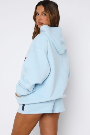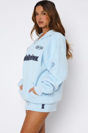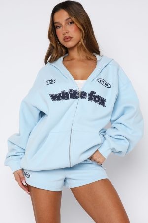 Indulge in the sporty aesthetic in the Ready To Go Zip Front Hoodie Baby Blue! Features a hood. zipper closure centre front. slouched shoulders. long sleeve with ribbed cuffs. two pockets. ribbed jumper hemline and signature puff print White Fox text and graphics centre front. Nail the matching set with the Ready To Go Lounge Shorts in Baby Blue and Ready To Go Oversized Tee in Baby Blue.