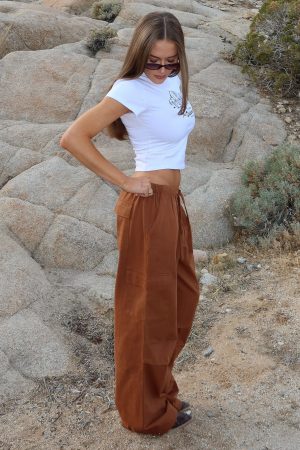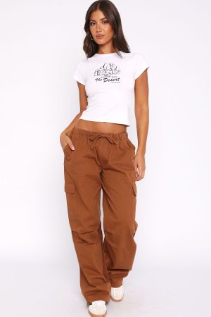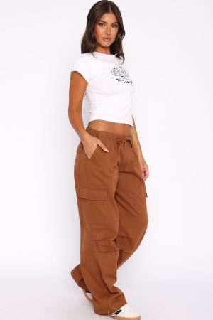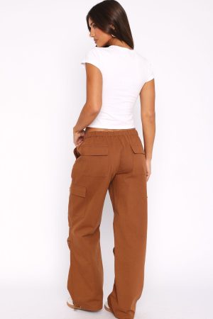 A must-have item that’s on trend and offers effortless vibes! The Real Satisfaction Cargo Pants Chocolate features elasticated waistband with drawstring. side pockets and wide leg fit. Pair with a cute crop and sneakers for a total cool girl fit!